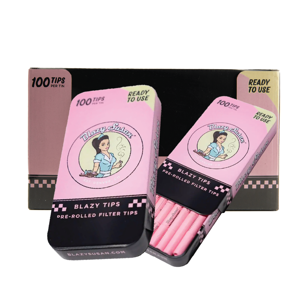 Blazy Susan Pre-Rolled Filter Tips in Tins: 100 Tips per Tin (12 Pack)